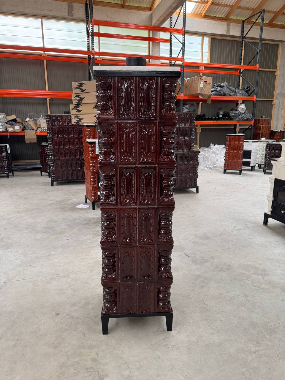 Această sobă înaltă, realizată din 6 rânduri de teracotă maro, este prevăzută cu cuptor practic și detalii din marmură, ceea ce îi conferă atât utilitate, cât și eleganță. Construcția verticală tip turn economisește spațiu, fiind ideală pentru încăperi medii, oferind în același timp o încălzire puternică și constantă.