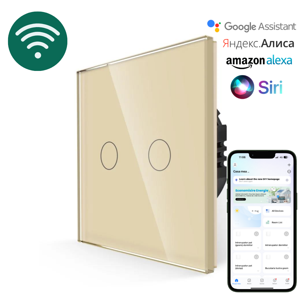 ???? 2 clape tactile – control facil al luminilor în două zone diferite.???? Compatibil WiFi (1 Way, cu fir de nul) – ușor de conectat la rețea și controlat de la distanță prin aplicații mobile precum Smart Life sau Tuya.???? Putere maximă: 600W – ideal pentru iluminat LED, incandescent sau alte tipuri de corpuri de iluminat.???? Control vocal – compatibil cu Google Assistant și Amazon Alexa pentru o experiență hands-free.???? Materiale de calitate superioară – durabil și sigur, cu finisaj lucios și sticlă temperată.
