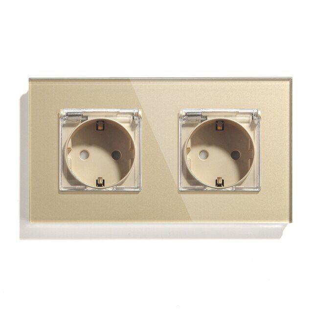 Priză Dublă Caligate GOLD – Ramă din Sticlă, Cu Capac Protecție Apă, 16A | 86x157 mm